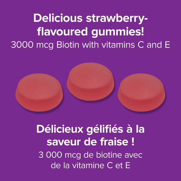 Make painful splitting nails and weak hair a thing of the past. Biotin supports hair, skin, and nail health, and helps improve hair strength and thickness. This formula also includes the antioxidant vitamins C and E, which help protect hair, skin, and nails from free radical damage. Self-care never tasted so good!