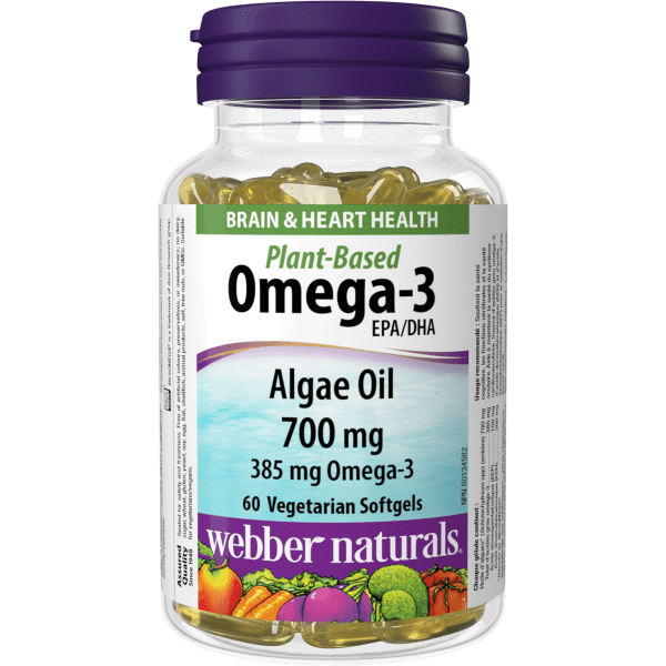 Plant-Based Omega-3 from Webber Naturals provides a fish-free, direct source of long-chain omega-3 EPA and DHA from sustainably cultivated algae. This environmentally friendly omega-3 formula is suitable for vegetarians, vegans, and anyone concerned about sustainability, plant-based nutrition, and healthy oceans.